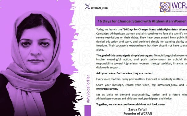 We launch the “16 Days for Change: Stand with Afghanistan Women” Campaign. Afghanistan women and girls continue to face the world’s most severe restrictions on their rights. They have been erased from public life, denied education and work, and punished simply for wanting dignity and freedom. Their courage is extraordinary, but they should not have to stand alone.